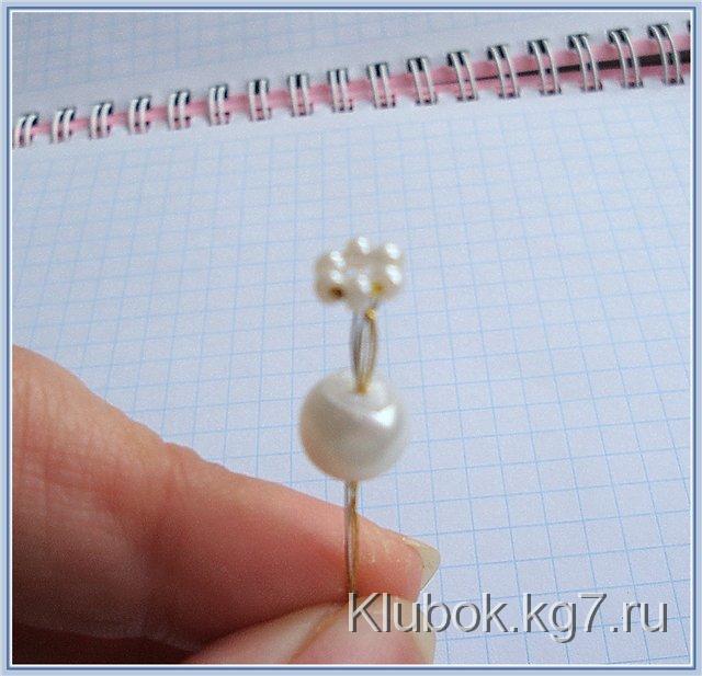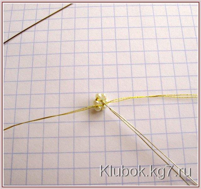 Белый жемчужный бисер 6 штук набрать на сдвоенную золотую нитку и несколько раз пройти колечко, чтоб дырочки бисера были «забиты». Хвостики нитки навстречу друг другу продеть в бисеринку 15 размера и связать. В ту же бисерину продеть проволочку 0.3мм