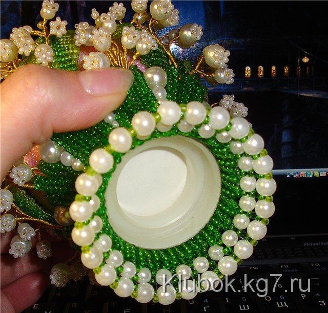 На рубашку яйца нашить 4 золотые полоски ндебеле на 2 бисерины 15 размера так, чтоб яйцо поделить на 4 одинаковых сегмента. Теперь примерить подставку и отметить тот бисерный ряд, до которого подставка доходит – это будет линия, от которой будут пришиваться стебельки букетиков. Приложить букетик ( начало ниточной обмотки должно приходится на отмеченный ряд), зафиксировать цветы резинкой, чтоб черенок не смещался от центра и пришить к рубашке туго затягивая. На ндебельные ленточки нашить по 2 веточки ландышей..