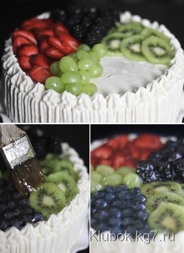 смажьте им фрукты и ягоды. Готовый торт поставьте охлаждаться до подачи к