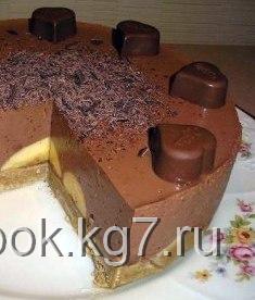 Бананы перерезать вдоль и уложить их на застывший корж. Вылить сверху крем.