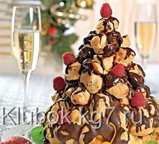 Обмакнуть в растопленный шоколад одну булочку и положить в узкий конец конуса. Затем положить 3 булочки. Обмакивая профитроли одну за другой в шоколад и укладывая их плотными горизонтальными слоями, заполнить весь конус. Последний слой должен быть максимально плоским. Наполненный конус поставить на ночь в холодильник.