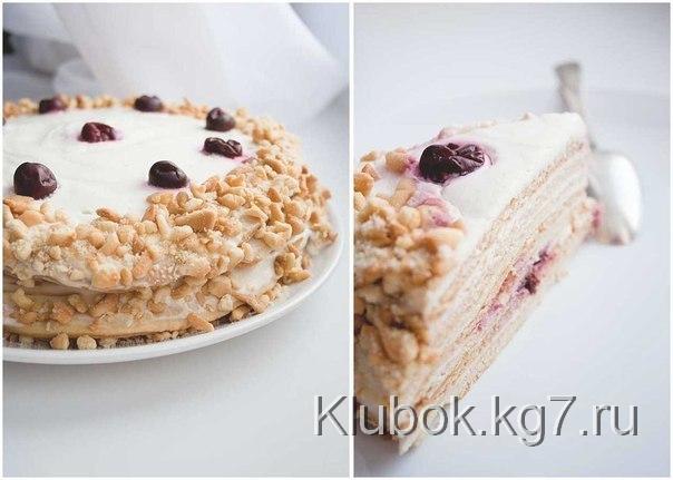 11. Густо промазать коржи кремом, проложить по вкусу вишней. Верх торта залить кремом, украсить крошкой и вишнями.