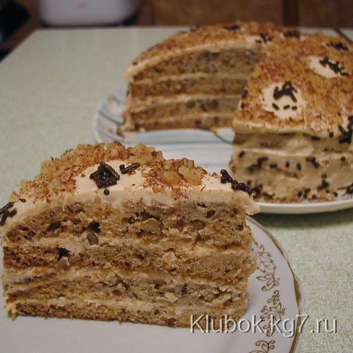 чередуя коржи и крем. Можно крем в прослойках посыпать орехами. Украсить по