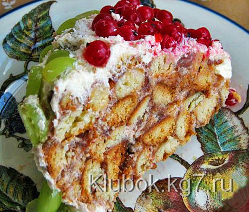 Тортик с украшением красной смородиной, ежевикой и зеленым виноградом.