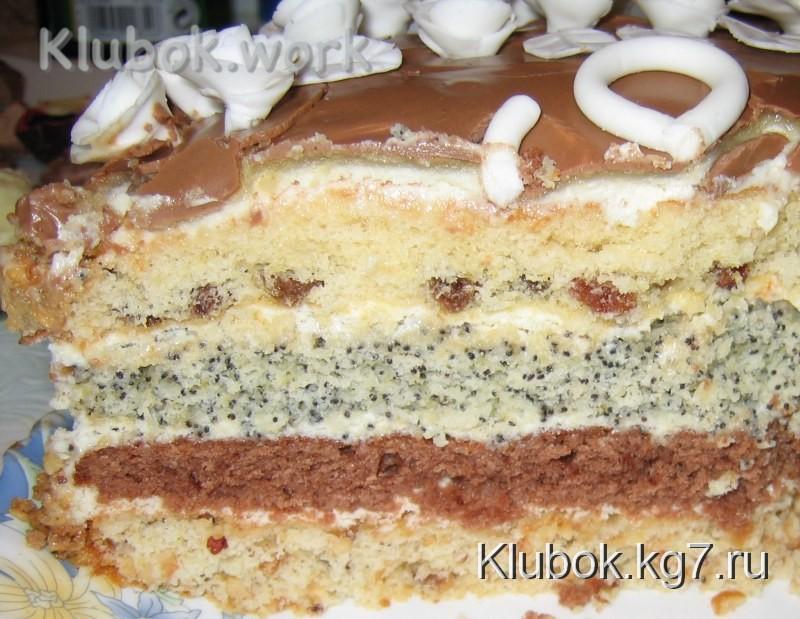 Торт состоит из НЕСКОЛЬКИХ коржей. Технология приготовления коржей одинаковая, отличается лишь тот момент, что в один из коржей добавляется мак, в другой изюм и в третий - рубленые орехи, в один не добавляем ничего, а ещё можно в один добавить какао.