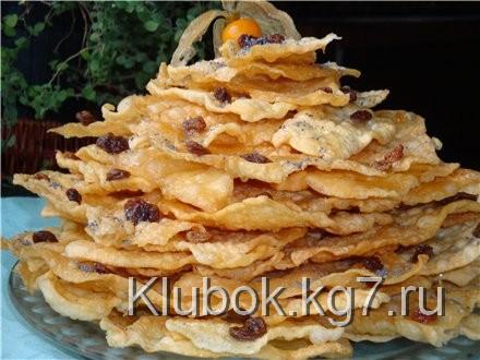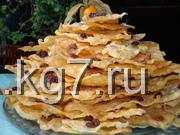 6. Далее сборка. Ну,тут,как конструктор,выкладываем наши хрусты,сверху струйкой(если очень густой сироп,добавьте еще одну-другую ложку воды) обливаем каждый сиропом и наверх следующий слой. Сироп,застывая,всё слепит.В конце,поверху,засыпаем по желанию орехами,изюмом и маком. У меня изюм и мак