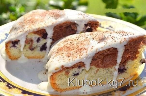 тесто добавить какао. Поверх белого теста выложить ягоды, обваленные в муке, и