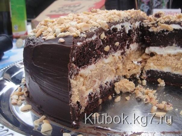6. Для придания торту аккуратного и красивого вида, подрежьте и подровняйте его стороны. Обмажьте бока оставшимся кремом и обсыпьте крошками от обрезки коржей. Сверху на торт вылейте шоколадную глазурь или растопленный шоколад, разровняйте ее и посыпьте арахисом. Готовый торт оставьте на три часа пропитываться, но сразу не убирайте его в холодильник.