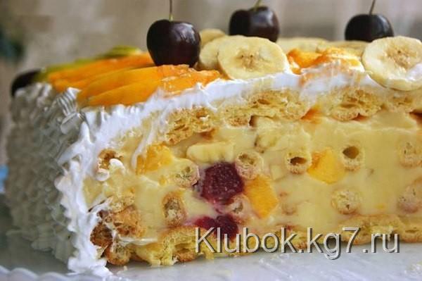 на блюдо для подачи выкладываем первый корж и заполняем пустоты между решетками нарезанными фруктами, промазываем кремом. Далее все по порядку: корж-фрукты-крем. Верхний корж смазать кремом без фруктов, разложить на нем тонко нарезанные дольки любых фруктов и залить желе для тортов. Оставить на ночь пропитаться в холодильнике.