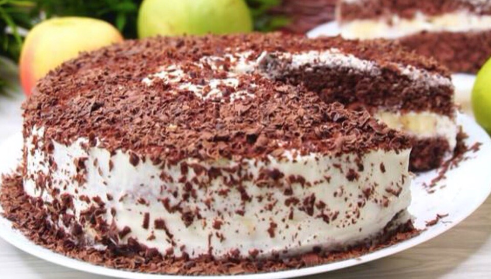 Так он точно не осядет. Извлекаем из формы, остывает он очень быстро. Сделаем надрез по бисквиту и разрежем при помощи нити на 2 части. 500 гр сметаны у меня жирностью 20 % смешаем с небольшим количеством сахарной пудры. Собираем торт. Делаем прослойку из банана.