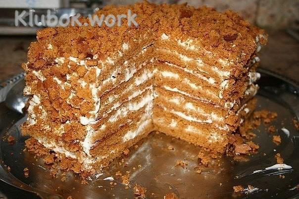 Простой медовый тортик, для тех, кто не любит раскатывать тестоKlubokhttp://klubok.work/4/138/7334/Klubokhttps://klubok.work/css/image/top-logo-en.pngИнгредиенты и приготовление: В кастрюльку кладем 100 гр. маргарина, 1 стакан сахара, 2 ст. л. мёда, 1 ч. л. соды и ставим на медленный огонь, помешивая, варим минут 10, до коричневого цвета. Снимаем с огня, добавляем 200 гр. сметаны, хорошо размешиваем и вбиваем 2 яйца. Массу взбиваем и добавляем 2 стакана муки. Всё хорошо размешиваем до однородной массы. Выливаем на лист, выстланный пекарской бумагой и печём при темп. 200 гр. где-то 15мин. Когда корж остынет, разрезать его пополам и вдоль по всей поверхности. Сложить коржи друг на друга и обрезать ровно край. Из обрезков сделать крошку. Коржи промазать взбитыми сливками с сахаром. 400 гр. сливок и 3 ст. л. сахара. Края тоже обмазать кремом и присыпать крошкой.