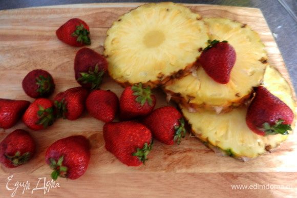 4. 200 гр клубники, разрежьте на половинки и уложите по периметру торта. Оставшуюся клубнику и ананасы нарежьте мелко, и смешайте с кремом.