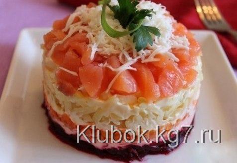 Можно сделать салат "вверх ногами" т. е. сёмгу вниз, а сверху все