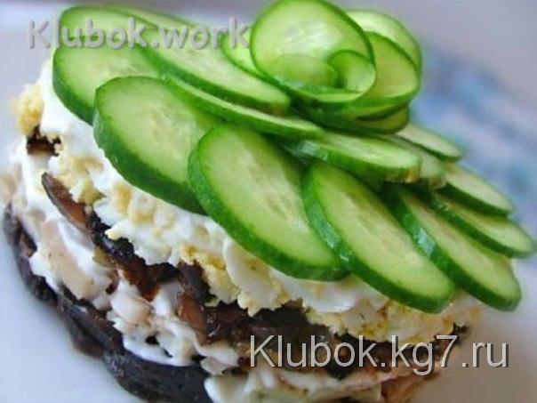 Чернослив ошпарить и нарезать. Курицу нарезать или разобрать на волокна. Обжарить лук и грибы. Выкладывать всё в следующей последовательности: чернослив, курица, лук с грибами, яйца (на терке), огурец (потереть на терке).
