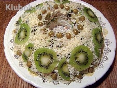 Теперь осталось украсить салат, сделать нефритовое кольцо. Сначала аккуратно вынимаем фужер, который помогал придать форму, затем тонко режем киви кружочками и половинками кружков, укладываем киви по кольцу, создавая узор. Зеленым горошком уложим цепочку на верхушке кольца и по нижнему краю. Можно использовать и другие продукты зеленого цвета, украсив салат, как подскажет фантазия.