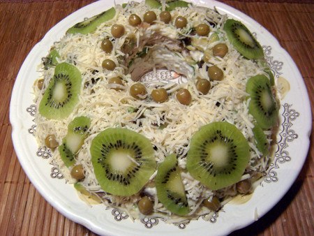 Теперь осталось украсить салат, сделать нефритовое кольцо. Сначала аккуратно вынимаем фужер, который помогал придать форму, затем тонко режем киви кружочками и половинками кружков, укладываем киви по кольцу, создавая узор. Зеленым горошком уложим цепочку на верхушке кольца и по нижнему краю. Можно использовать и другие продукты зеленого цвета, украсив салат, как подскажет фантазия.
