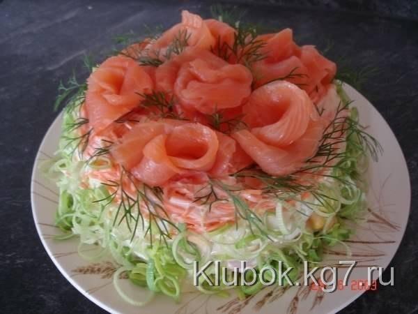 Украшается салат по-разному, можно как на - фото резаным копченым лососем, скручиваем в розочки, можно креветками с красной икрой и т.д, по бокам мелко в колечки нарезанный порей, или любой нарезанной зеленью (укроп,лук,петрушка)