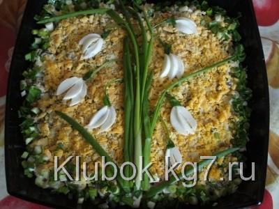 Филе курицы, отварной картофель3-4 шт, одна большая морковь, одно яблоко, зелёный лук, 4 яйца, зелёный горошек, маринованные огурцы 3 штуки, немного укропа. Всё порезать и смешать с майонезом