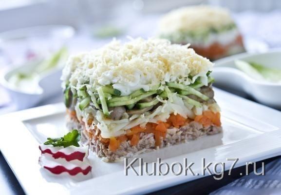 Layer the salad: salmon - carrots - potatoes - mushrooms - cucumber. Drizzle with mayonnaise, sprinkle with egg and cheese. If desired, the layers of the salad can be spread with a thin layer of mayonnaise.