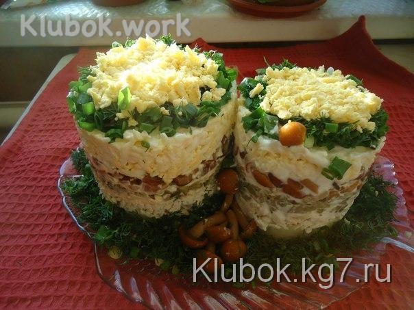 тертый картофель,куриное отварное филе,тертый маринов. огурц,маринов.опята,тертые яйца,каждый слой промазать майонезом(один пенечек промазан для меня натур. йогуртом),сверху зелень и тертый желток.
