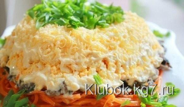 Layering:carrotsmushrooms (I have fried champignons)eggsgrated cheesespread all layers with mayonnaiseon top, add green onions.