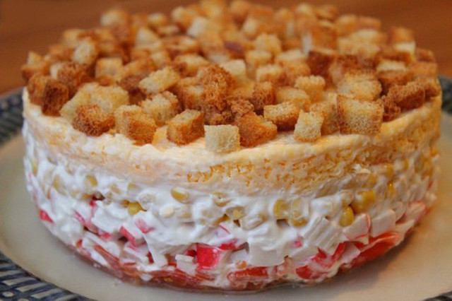 Салат Klubokhttp://klubok.work/4/139/7262/Klubokhttps://klubok.work/css/image/top-logo-en.pngСалат "Коррида" Наступает время новогодних праздников. Предлагаю всем хозяйкам на заметку рецепт отличного салатика, который можно приготовить как на праздник, так и для семейного уютного вечера. В салате всего лишь 6 ингредиентов. Потому и готовится такой салат достаточно просто и быстро. Потому почему бы Вам не порадовать своих родных. Закладывайте рецепт салата в закладки, чтобы не потерять. Ингредиенты: помидоры 3—4 шт. чеснок 2 зубчика майонез крабовые палочки 200 гр. кукуруза консервированная 1 банка сыр (любой, кроме твердых сортов) – 200 гр. сухарики 1 пачка Способ приготовления Шаг 1 1- й слой: помидоры режем маленькими кубиками, солим, добавляем пропущенный через пресс чеснок и сливаем сок с помидор (это обязательно, не нужен нижний влажный слой). Смазываем майонезом. Шаг 2 2- й слой: крабовые палочки режем маленькими кубиками. Майонез. Шаг 3 3- й слой: кукуруза. Майонез. Шаг 4 4- й слой: сыр трем на средней терке. Майонез. Шаг 5 Верх салата украшаем сухариками. Приятного аппетита!
