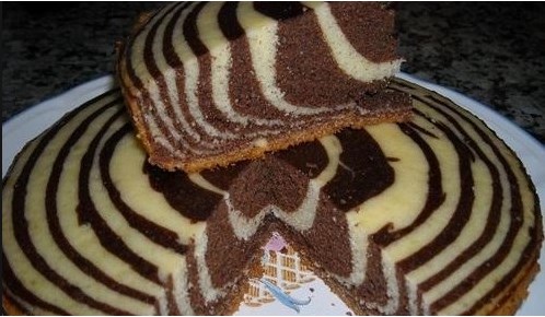 Как испечь вкусный и красивый пирог "Зебра" Сметана 200 г Сода гашеная 1 ч. л. Яйцо куриное 3 шт. Маргарин 50 г Какао-порошок 2-3 ст. л. Мука 2 ст. Сахар кондитерский 240 г Приготовление: Взбить яйца с сахаром до состояния легкой пенки. Растопить маргарин(или масло сливочное). Погасить соду в уксусе(или сметане). Смешать растопленный маргарин со взбитыми яйцами, сметаной, погашенной содой и мукой. Тесто должно выглядеть как густая сметана. Делим тесто пополам и одну смешиваем с какао. Разогреваем духовку до 180-200 градусов, смазываем противень сливочным маслом и выкладываем тесто в центр по очереди 3 ложки белого, 3 лодки коричневого, оно будет растекаться, образуя круги С помощью деревянной шпажки делаем узор, как показано на фото. Выпекаем торт 40 минут. Приятного чаепития!