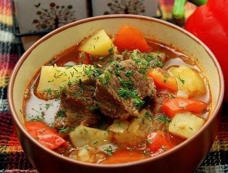 Состав: телятина - 700 гр., лук реп. - 2 шт., перец болгарский - 2 шт., томаты - 4 шт., картофель - 700 гр., паприка сухая - 1 ст.л., вода - 1 л., крахмал - 2 ст.л., майоран, перец чили, специи и соль - по вкусу.