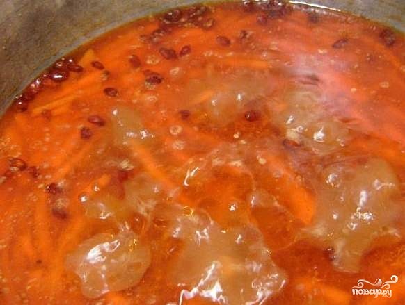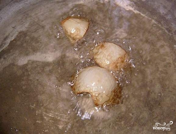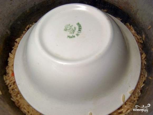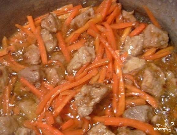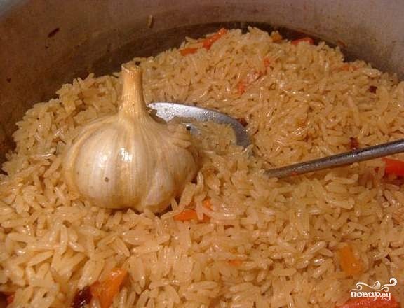 Очищаем морковь и обязательно нарезаем соломкой толщиной примерно 0,5 см. Нарезаем мясо. Кусочки среднего размера. Ставим казан на плиту, наливаем в него масло и, когда масло достаточно раскалится, бросаем в масло несколько лепестков лука. Лук должен прожариться до темно-коричневого цвета. Выбрасываем прожаренный лук и закладываем в казан нарезанный лук, пусть подрумянится. Затем к луку отправляем мясо и даем ему подрумянится. Не забываем помешивать. Подошла очередь морковки. Можно жарить ее до мягкости, а можно и чуть подольше - это зависит от вашего вкуса. Промываем рис под проточной водой до тех пор, пока вода не станет прозрачной. В казан с мясом наливаем 1,5 л воды, соль и специи и оставляем тушиться минут 20. Аккуратно высыпаем поверх мяса рис. Стараемся распределить его равномерно. Затем погружаем в рис головку чеснока и варим на среднем огне до тех пор, пока жидкость не опустится ниже уровня риса. Собираем рис горкой и накрываем глубокой тарелкой. Желательно накрывать плотно. Готовим еще минут 15-20 и выключаем. Вынимаем чеснок и перемешиваем плов. Подаем к столу.