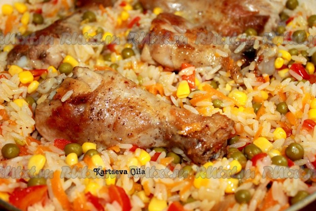 Курица с рисом и овощами по-каталонскKlubokhttp://klubok.work/4/140/8278/Klubokhttps://klubok.work/css/image/top-logo-en.pngОбожаю готовить курицу с рисом по этому рецепту. Аромат во время приготовления стоит просто неописуемый… А вкус... Ммм… Пальчики оближешь! А еще блюдо получается очень жизнерадостным и ярким. Приготовьте такую курочку с рисом и овощами, и Вы не пожалеете! Для приготовления курицы с рисом и овощами по-каталонски понадобится: куриные голени - 4 шт. (можно бёдра, грудку); лук репчатый – 1 шт.; морковь – 1 шт.; перец болгарский – 1 шт.; помидор - 1 шт.; зеленый горошек – 1 баночка; кукуруза - 1 баночка; чеснок – 2 зубчика; рис – 1 стакан; вода/бульон – 1,5-2 стакана; соль, специи – по вкусу; растительное масло для жарки. Необходимые продукты для приготовления курицы с рисом и овощами по-каталонски. Курицу разморозить, натереть солью со специями. На сковороде разогреть растительное масло и обжарить в нем куриные голени до золотистой корочки, затем переложить на тарелку и оставить на некоторое время. Лук мелко порезать, морковь натереть на терке. Перец нарезать кубиками. Помидор нарезать мелкими кусочками. Чеснок пропустить через пресс или мелко порезать. На том же масле, в котором жарилась курица, обжарить лук до прозрачности и морковку. Затем добавить перец и помидорку, чеснок. Все овощи потушить минут 5. Далее влить воду или бульон к овощам, а затем всыпать рис. Всё хорошенько перемешать, посолить. Довести до кипения. Тушить на среднем огне минут 25-30 (ориентироваться на готовность риса). С горошка и кукурузы слить воду, а минут за 7 до готовности добавить к рису и другим овощам. Периодически помешивать, чтобы рис не пригорел. По необходимости доливать жидкость. Проверить, достаточно ли соли. В конце положить курицу поверх риса и овощей, всё накрыть крышкой и томить на медленном огне еще минут 10. Получается очень красивое, ароматное и сытное блюдо.