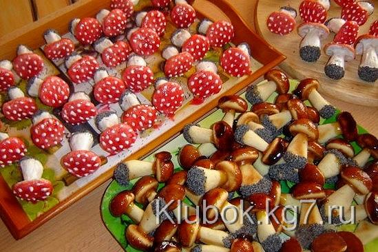 Red coloring for the caps of fly agarics: mash 1/2 cup of cranberries, boil for 3-5 minutes with 1/4 cup of sugar, and strain hot through a sieve.