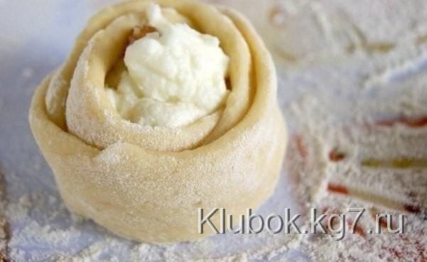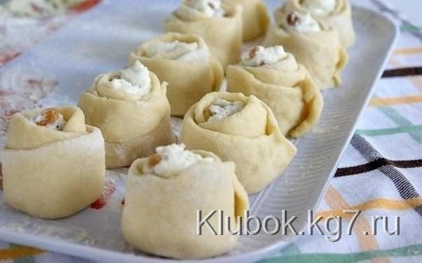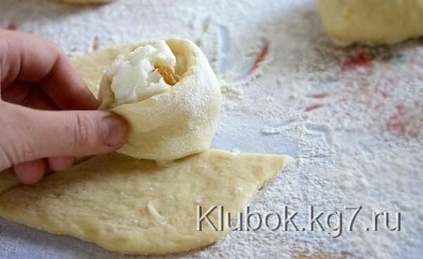 Одну из трёх частей (самую маленькую) оборачиваем вокруг творога и скрепляем.