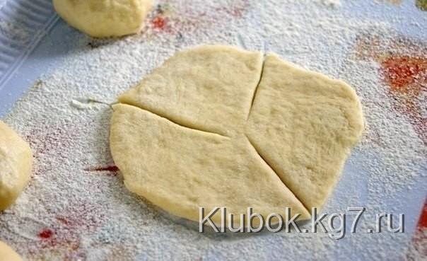 Лепешку раскатываем, делаем 3 разреза так, чтобы части были немного разные, одна часть чуть больше другой