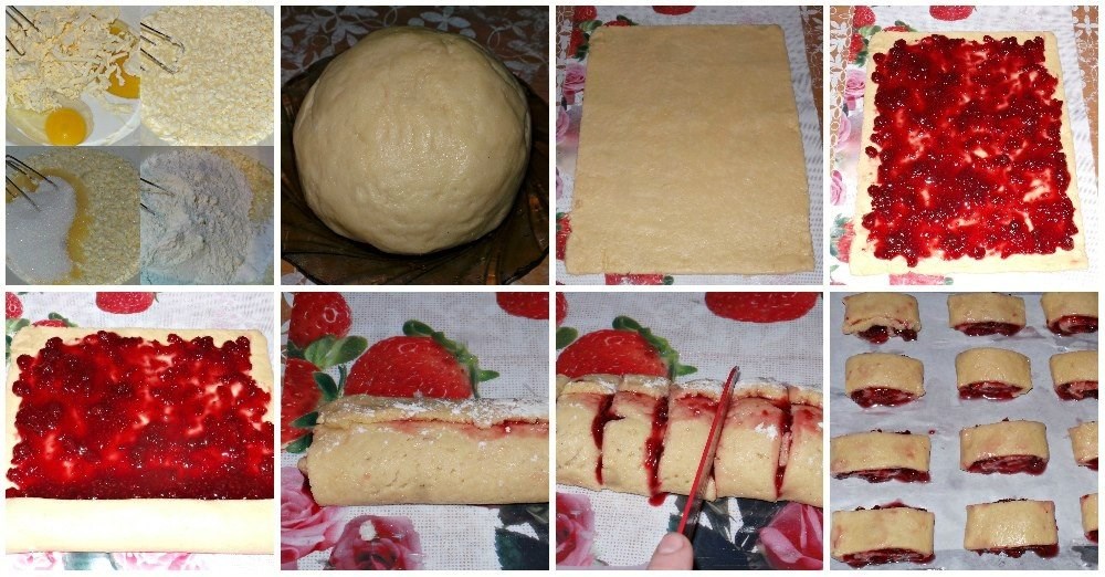 Раскатать тесто в тоненький пласт, смазать густым вареньем или джемом, по желанию можно добавить в варенье крахмал.Завернуть пласт рулетом.