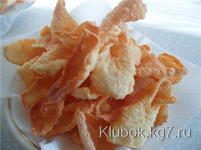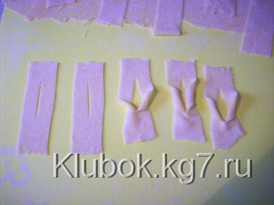 нарезать ромбики,вывернуть одну сторону наизнанку и жарить во фритюре в хорошо разогретом масле.