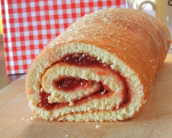 5. So, remove the jam from the heat and take the cake out of the oven. Remove the paper and spread one side with warm jam, roll it up and generously sprinkle with powdered sugar.