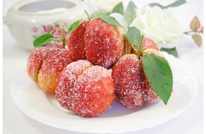 To prepare the shortcrust pastry, gather the following ingredients: flour (sifted), room temperature butter, eggs, sugar, and sour cream. Beat the eggs with sugar and vanilla. Add the butter, sour cream, half of the flour, and baking powder. Mix with a mixer until a soft dough base forms. Add the remaining flour and knead a soft dough. Divide the dough into 24 balls. Shape them into half-spheres. Place on a baking sheet lined with parchment and bake at 190°C for 15 minutes. Let the finished halves of the future "peaches" cool on a rack. Remove the insides from the halves.