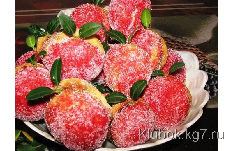 then dip the uncolored part into the beet juice and immediately roll in sugar. The "peaches"