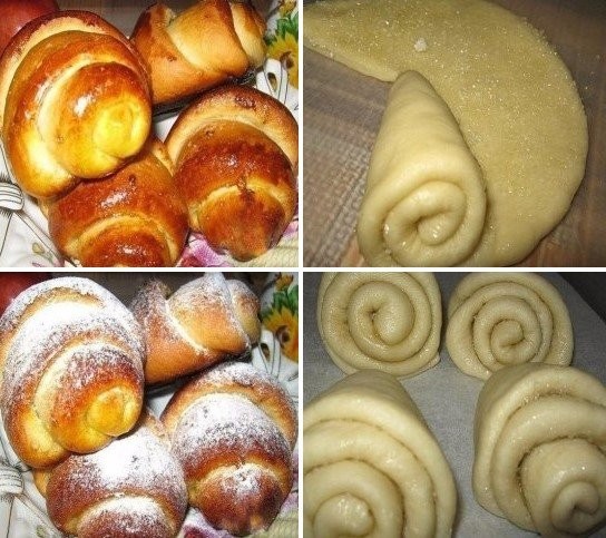 Divide the finished dough into balls the size of a small egg and roll them into thin cakes. Grease each of them with vegetable oil, sprinkle with sugar, and make a cut with a sharp knife from the middle to the edge. Lift the edge of the cakes on one side and roll them in a circle into a cone. Place the buns on a baking sheet lined with baking paper, let them rise for about 15-20 minutes (you can brush with egg yolk) and place in an oven preheated to 190 degrees. Bake for about 30 minutes until done. The buns will rise and spread while baking, creating beautiful twists. When serving, sprinkle with powdered sugar.