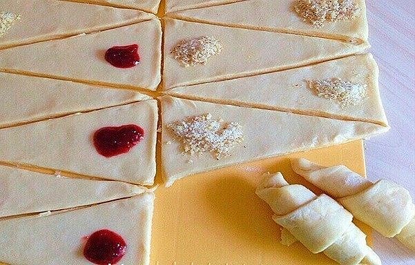Очень вкусные, мягкие, рассыпчатые рогалики, просто тают во рту. Для теста 1: ? сметана - 200 гр ? мука - 300 гр ? разрыхлитель - 0,5 ч.л. Для теста 2: ? сливочное масло - 200 гр (комнатной температуры) ? мука - 250 гр ? разрыхлитель - 0,5 ч.л. Варианты начинки: ? ягодный джем ? шоколадный крем нутелла ? изюм ? орехи с сахарным песком Приготовление: 1. Для теста 1 в миску просеять муку с разрыхлителем, добавить сметану и вымесить тесто. 2. Для теста 2 в миску просеять муку с разрыхлителем, добавить размягченное сливочное масло и вымесить тесто. 3. Каждое тесто скатать в шар и выложить на рабочий стол, присыпанный мукой. 4. Отдельно каждое тесто раскатать в пласт толщиной около 1,5см, сложить пласты один на другой. 5. Раскатать тесто в пласт толщиной 1см и сложить конвертом. 6. Вновь раскатать в пласт и сложить конвертом. Повторить процесс складывания/раскатывания ещё 2 раза. 7. Затем сложит тесто конвертом ещё раз, завернуть в пленку и убрать в холодильник на 30минут. 8. Я готовила двойную норму теста, поэтому после холодильника тесто слегка раскатала и разрезала на 2 пласта, пока из одного пласта делала рогалики, второй дожидался в холодильнике. 9. На фото видно какой слоистой получается структура теста. 10. Вынув тесто из холодильника раскатать его в прямоугольный пласт толщиной 0,5см, разрезать на 2 длинных полосы и каждую из полос нарезать на треугольники с основанием около 4-5см. 11. У основания треугольников уложить начинку и свернуть рогаликом, при этом слегка растягивая в стороны 12. уголки основания треугольника, чтобы середина рогалика не получилась слишком толстой. 13. Рогалики уложить на противень на некотором расстоянии друг от друга и выпекать в нагретой до 180 град С духовке до золотистого цвета (около 12-15минут). 14. Полностью охладить и присыпать сахарной пудрой. Приятного аппетита!