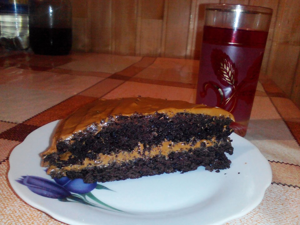 Соединяем муку, какао, кофе, разрыхлитель и соду. Сахар сбиваем с мягким (маслом), добавляем яйца. В стакан с теплым молоком вливаем уксуси ждем пару минут .Все соединяем: масло с мукой, а потом - молоко. Выиваем в розьемную форму. Чтобы не образовался горбик - в центре делаем вилкой ямку. Выпекаем при температуре 200 градусов 30-35 минут. Даем полностью остыть в форме. Разрезаем корж на 2 или 3 частьи. Увлажняем коржи. Перемазываем кремом.