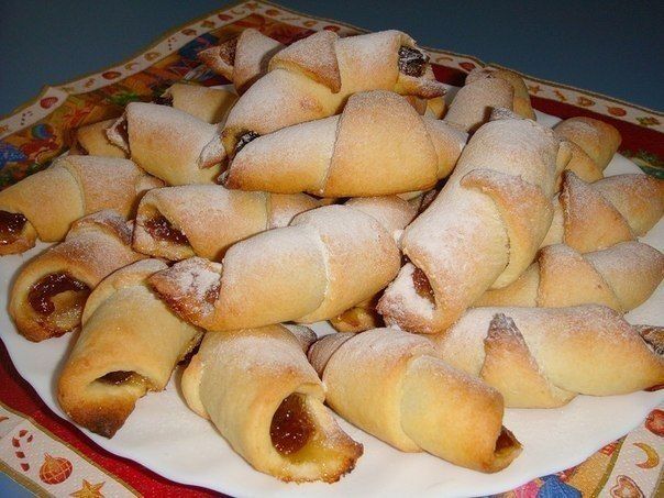 Готовое тесто можно немного оставить, минут на 10-15, чтобы оно «пришло в себя». Затем раскатать часть теста в круг, смазать повидлом или любым вареньем на ваш вкус, оставив сухими края и порезать на секторы — крупные или мелкие, как вам нравится. Теперь скатайте рогалики и выкладывайте на посыпанный мукой противень.