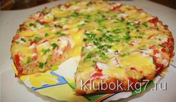 Pour the dough into the pan, drizzle with ketchup, place the sausage, sprinkle with tomatoes, sprinkle with cheese and green onion.