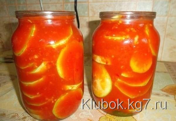 4. Горячим томатным соусом залить в банки с кабачками. Накрыть крышкой и простерилизовать 25 минут, с момента закипания воды в кастрюле.