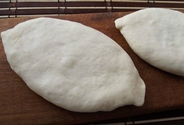 Каждый мячик раздавливаем в лепешку, внутрь отправляем ложку начинки, защипываем края и в руках пирожочек сплющиваем до толщины 1 см (так, чтобы начинка не порвала тесто).
