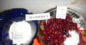 - Вишня (Вишня у меня была замороженная ,косточки я удалил.Начинку можно менять по своему желанию, я пёк с апельсинами, абрикосами и т.д.) — 250 г