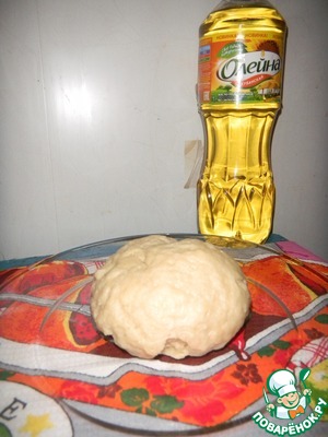 В муку добавляем сахар и соль. Вливаем воду с маслом "Олейна". Замешиваем мягкое тесто. Немного отделяем и кладем в морозилку немного застыть.