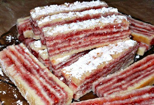 jam or preserves; I used 2 tsp of raspberry jam per layer, and we stick them together, laying one layer on top of the other. Put a weight on the glued layers for 30-40 minutes. Remove the weight and sprinkle the cookies with powdered sugar. Cut into equal-sized portions. Enjoy your tea!