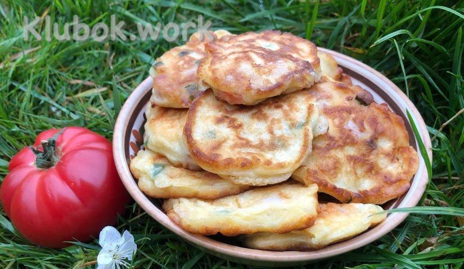 Можно сделать блины так: на сковороду выливаете порцию теста. Сразу же посыпаете лепешку мелко измельченной зеленью, отварным яйцом или мясом — добавлять можно любые продукты. Потом переворачиваете блин и обжариваете его с другой стороны.