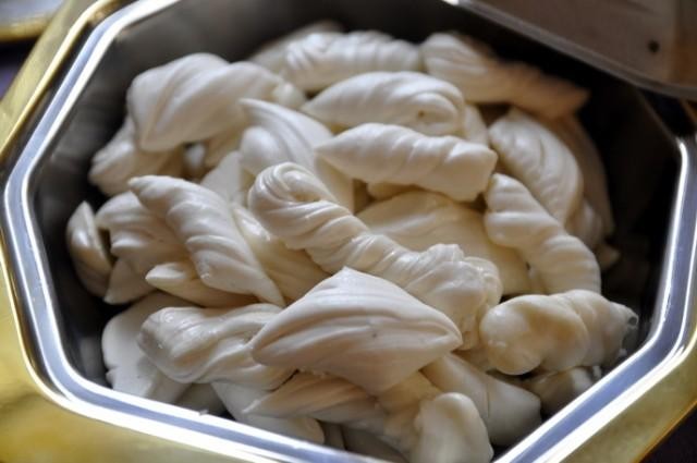 On a table also greased with butter, cut the ropes with culinary scissors into candies of any shape and size.